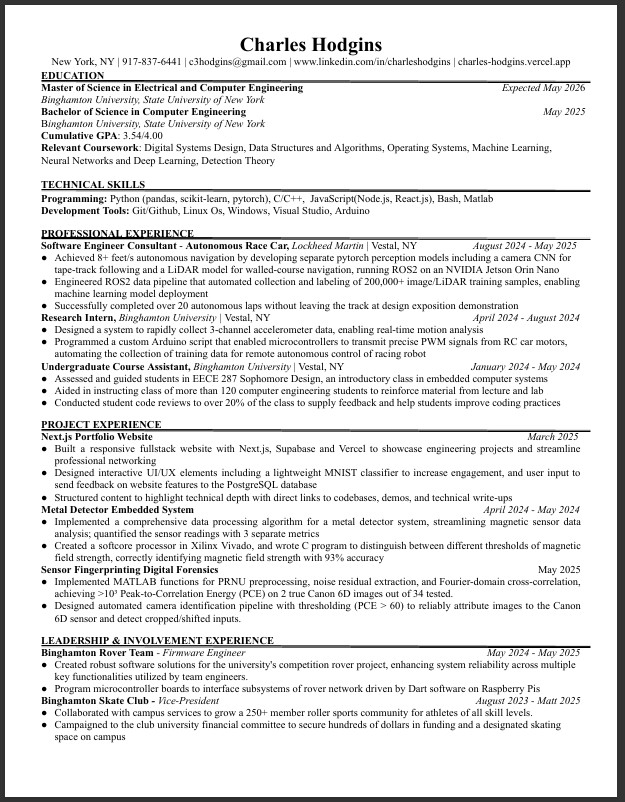 I'm Charles Hodgins, an aspiring Software Engineer studying Computer Engineering at Binghamton University, with a passion for engineering solutions with application development, machine learning and embedded systems!